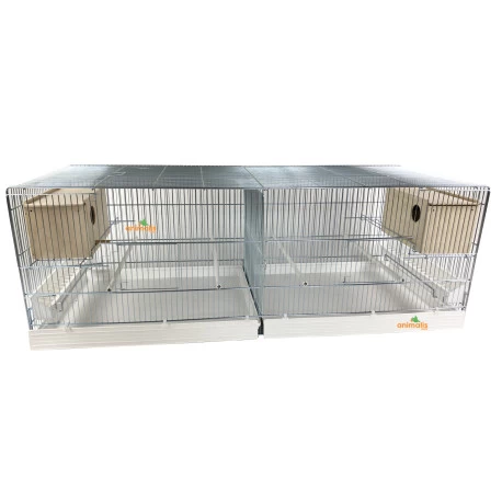 La cage est fournie avec 2 mangeoires linéaires, 4 perchoirs, 1 séparation grillagée, 2 tiroirs, 2 clapets et 2 nids en bois.