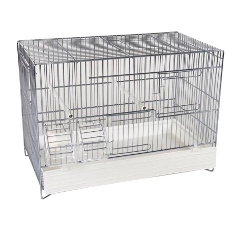La face avant de la cage est composée de 2 portes ( 1 porte d’accès et 1 porte conçue pour mettre un nid) et de 2 mangeoires transparentes.