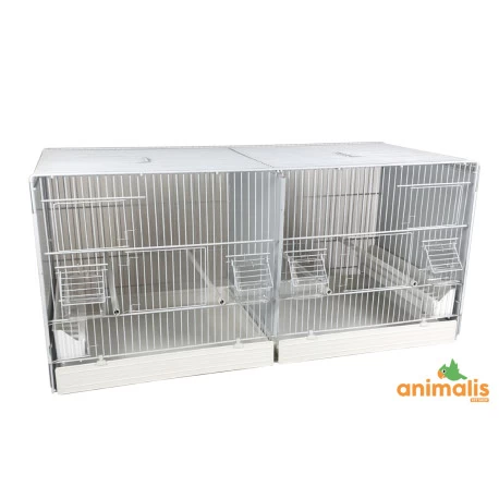 La face avant de la cage est composée de 4 portes ( 2 portes d’accès et 2 portes conçues pour mettre un nid), 4 mangeoires transparentes de 2 mangeoires linéaire.