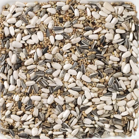 Composition : Millet jaune 18%, tournesols striés 15%, tournesols blanc 15%, millet blanc 10%, alpistes 9%, avoine pelée 7%, cardi 6%, millet japonais 4%, sarrasin 3%, chanvre 3%, riz paddy 3%, graines de lin 3%, cardi 2 2%, niger 2%