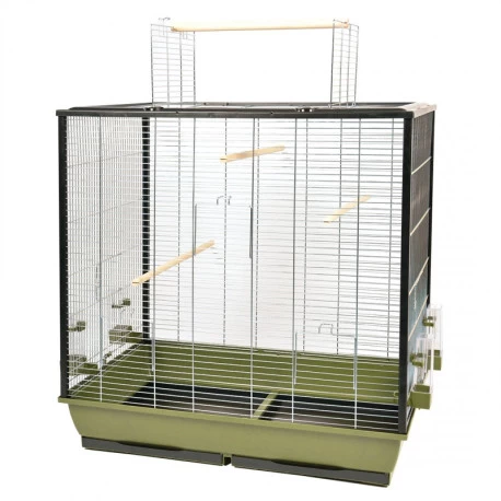 Cette cage renferme 4 mangeoires et abreuvoirs, 4 perchoirs et 2 tiroirs rétractables.