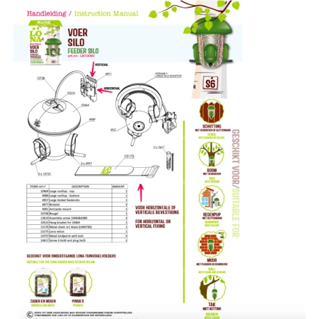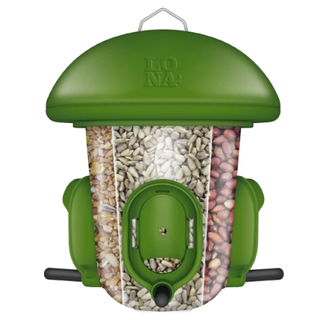 LONA S6 est un silo d’alimentation pour oiseaux avec 3 entrées d’alimentation et 3 compartiments séparés. Cela permet de mettre 3 types d’alimentation différents en même temps.