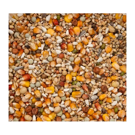 Maïs cribbs 14%, maïs plata 13%, froment blanc 12,5%, cardi 6%, sorgho blanc 5%, maïs merano 5%, dari extra blanc 4%, petit maïs cribbs 4%, petits pois verts 4%, sorgho rouge 4%, pois maple peas 3,5%, soja torréfié 3%, pois dunpeas 3%, chanvre 2,5%, vesces 2,5%, pois verts 2%, kadjang idjoe 1,5%, pois 1,5%, tournesols striés 1%, riz paddy 1%, avoine pelée 1%, orge 0,5%, graine de lin 0,5%, sarrasin 0,5%, chardon marien 0,5%, millet jaune 0,5%, popcorn maïs 0,5%, quinoa 0,5%, graine de sésame 0,5%, alpistes 0,5%, lentilles 0,5%, colza 0,5%.